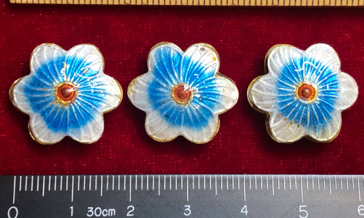 > ¶!¶ 有線七宝焼ワールド - 3個の六弁花型ペンダント ¶!¶ 約厚8㎜×20㎜ 金線に白水色釉六弁花 手作り 手芸 工芸 インテリア ペンダント