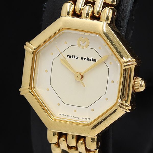 - 良品 ミラショーン QZ 6031-A03335 オクタゴン 6031-A03335 アイボリー文字盤 ゴールド GP SS レディース腕時計 KMR