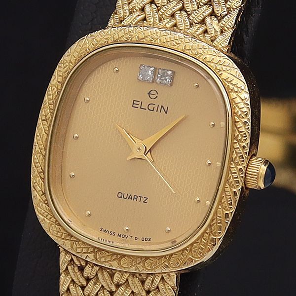 - 良品 エルジン QZ FK277 ゴールド文字盤 石付 スクエア レディース腕時計 NKG