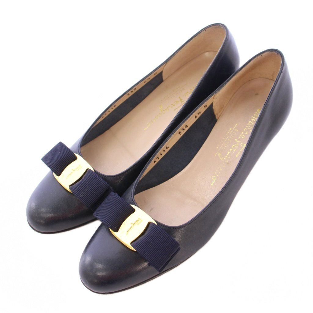 - サルヴァトーレフェラガモ Salvatore Ferragamo BOUTIQUE ヴァラリボン パンプス ラウンドトゥ ローヒール レザー ロゴ 6.5 紺