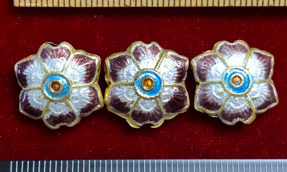 > ¶!¶ 有線七宝焼ワールド - 3個の六角花型ペンダント ¶!¶ 約厚5㎜×15㎜ 金線に褐白色釉水橙花芯 手作 手芸 工芸 インテリア ペンダント