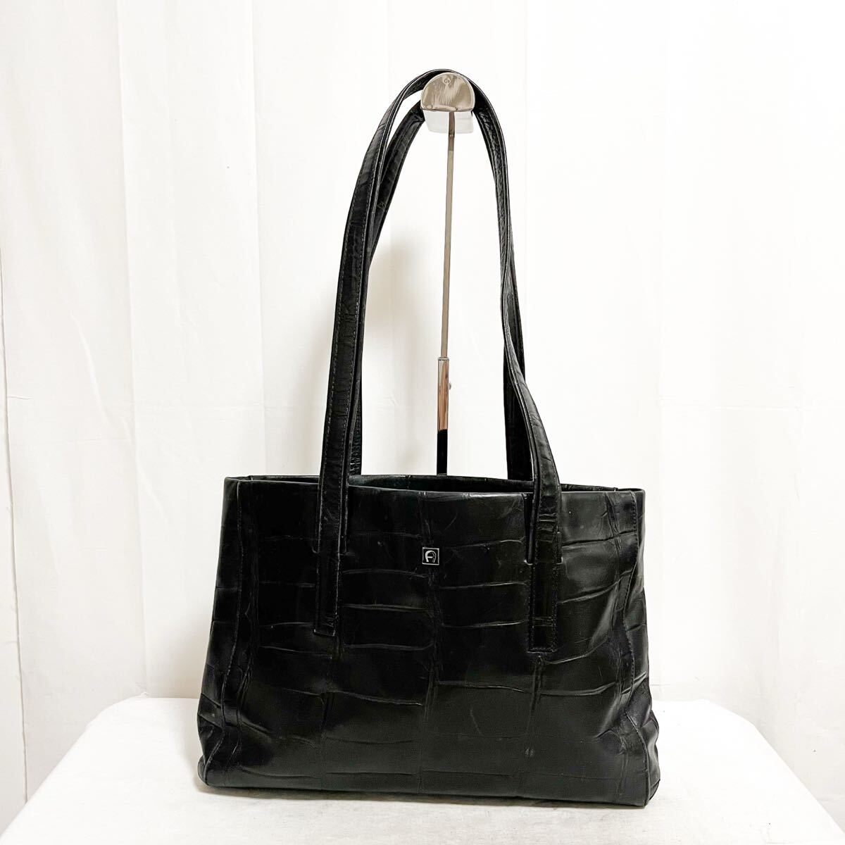 - 和837★ AIGNER アイグナー レザーバッグ トートバッグ 肩掛けバッグ 型押し ブラック レディース