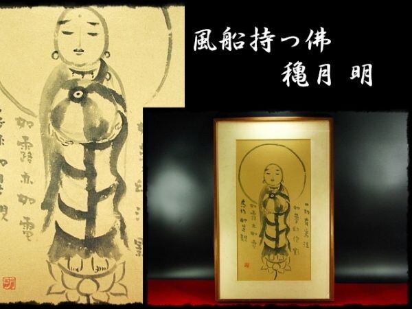 - ∴名工館∴【送込!穐月 明】風船持つ佛 日本画 肉筆 額装 共シール 真作保障 送料無料 16 b183