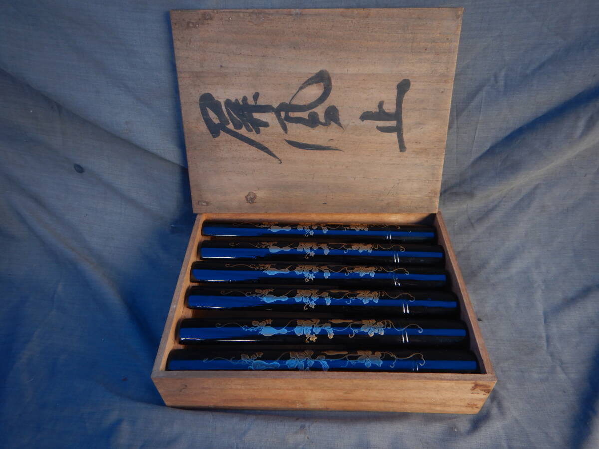 > 時代もの 蒔絵 瓢箪の図 ひょうたん 漆器 屏風押さえ 屏風止 屏風挟 6本 箱付き 木製黒塗り 漆塗り 古道具 骨董 アンティーク