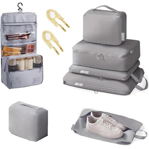 - ☆人気商品 2025年最新 トラベルポーチ 圧縮 9点セット 旅行 分け 温泉 出張 海外 修学旅行 靴用 下着収納 グレー 76