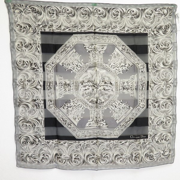 > #ae クリスチャンディオール Christian Dior スカーフ 黒 グレー 総柄 大判 シルク 絹 シースルー ディオール タグ付き 美品 [931633] k01