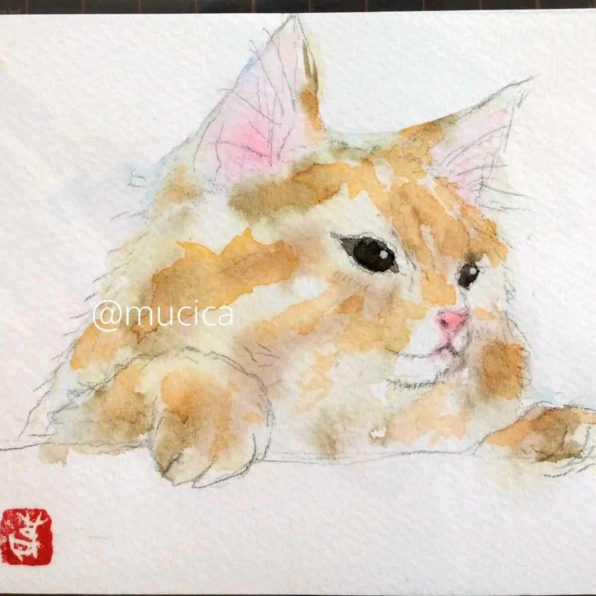- 肉筆原画 水彩画 手描きイラスト 猫 A6 ネコ