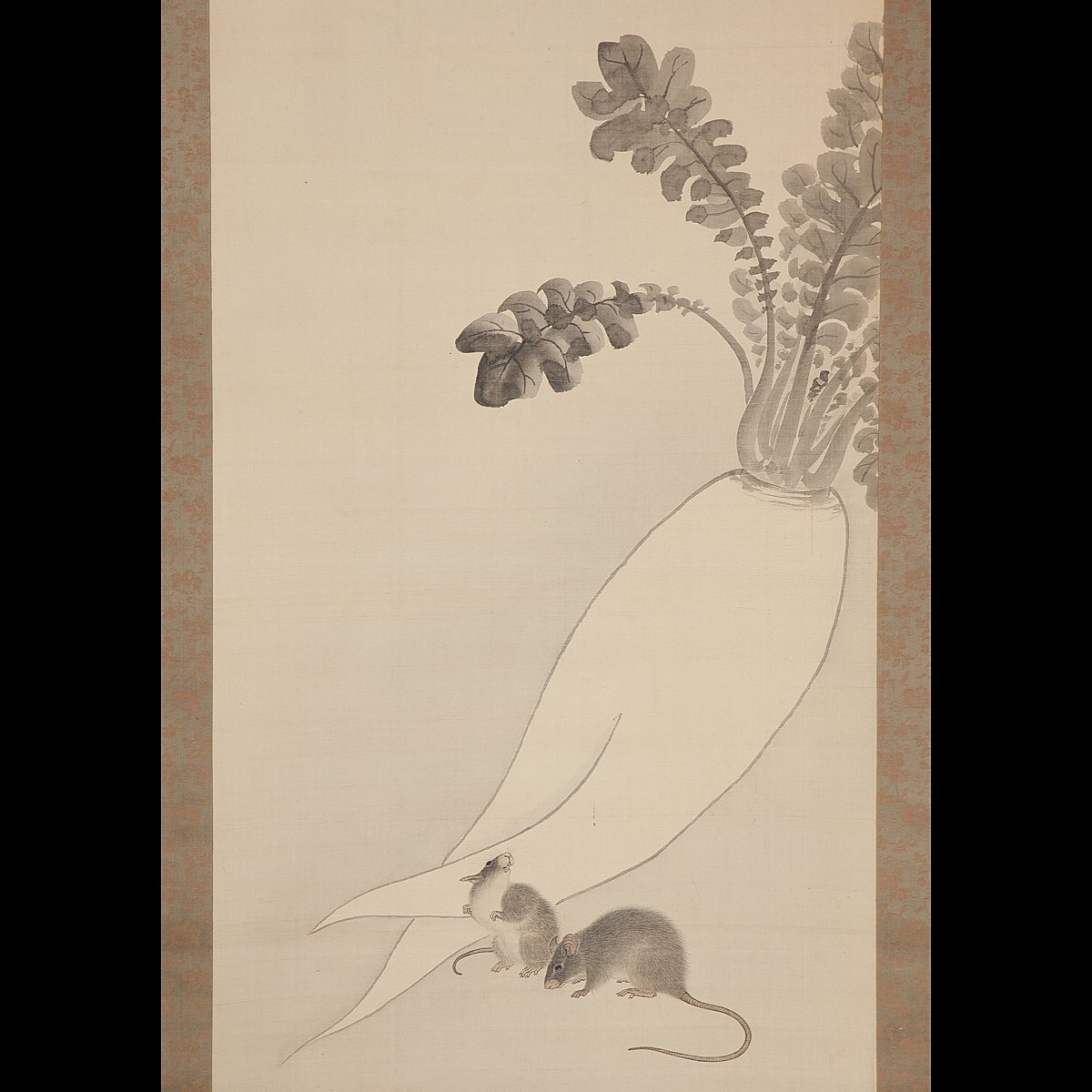 “商品説明の『続きを見る』もしくは携帯端末アプリの『もっと見る』から追加画像をご覧ください” “出品は予告なく取り下げる場合があります。あらかじめご了承ください。” 商品説明 品名 晴雲 『大根に鼠』 絹本 淡彩 掛軸 寸法 軸・・・縦195.5cm 横65.5cm 内・・・縦112.5cm 横51cm ※寸法に若干の誤差が生じます。ご承知下さい。 状態 本紙:ヤケ 表具:シミ、シワ、虫喰 軸先:1ヶ所欠落 箱:無 略歴 備考 本品は印刷ではなく肉筆です。 補足 送料 ■ゆうパック100サイズ(詳細は以下の〈配送方法〉を参照して下さい) ※形状・性質が異なるものは同梱をお断りさせていただく場合がございます。同梱の場合、サイズ変更により表示される送料の金額を修正させていただく場合がございます。予めご了承いただきますようお願い致します。 ※2023年10月より日本郵便の郵便価格改定により、配送料を改訂させていただきます。何卒ご理解の程よろしくお願い致します。