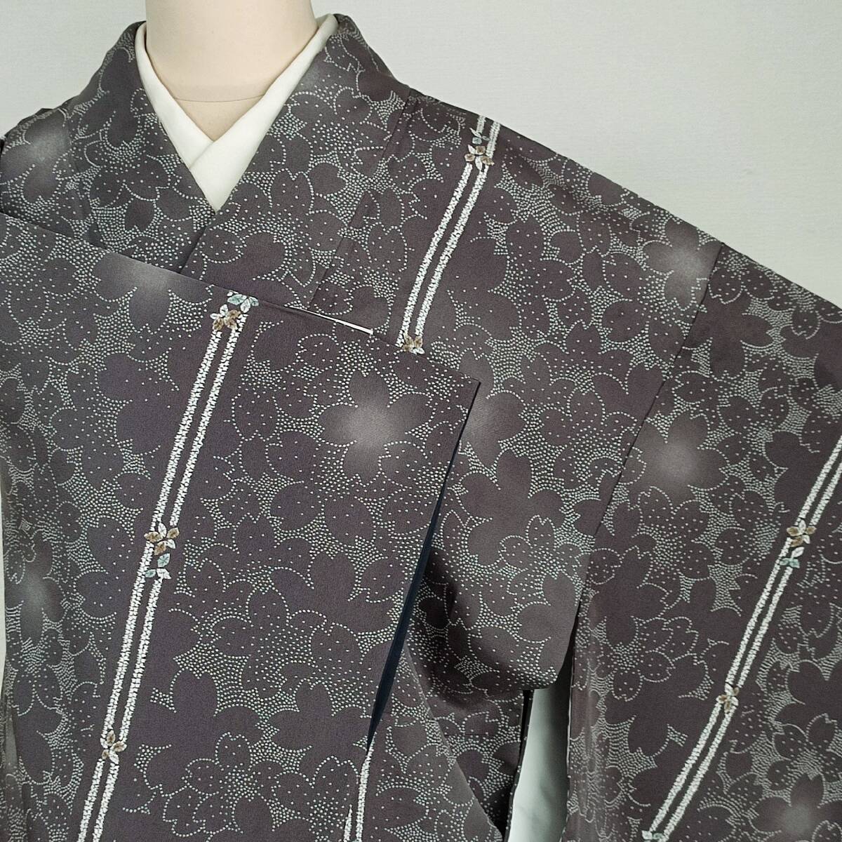 - 即決■着物の越田■裄66身丈164.5 正絹 小紋 袷 美品 グレー系 縦縞 観劇 美術館巡り お食事会 同窓会 お出かけ イベント■む16E08