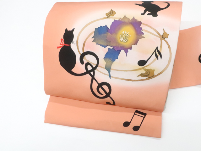 - 《古美術京松》リサイクル着物 オリジナル 九寸名古屋帯 お太鼓柄 猫に花 ネコ 正絹 sok7b09-46