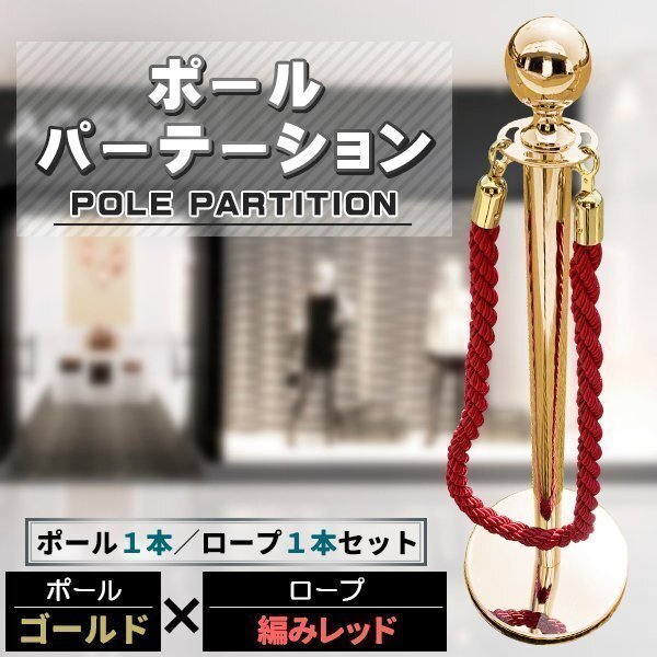 - ポールパーテーション 1本 セット ゴールドポール レッドロープ 縄 ガイドポール ポール スタンド パーテーション 通路