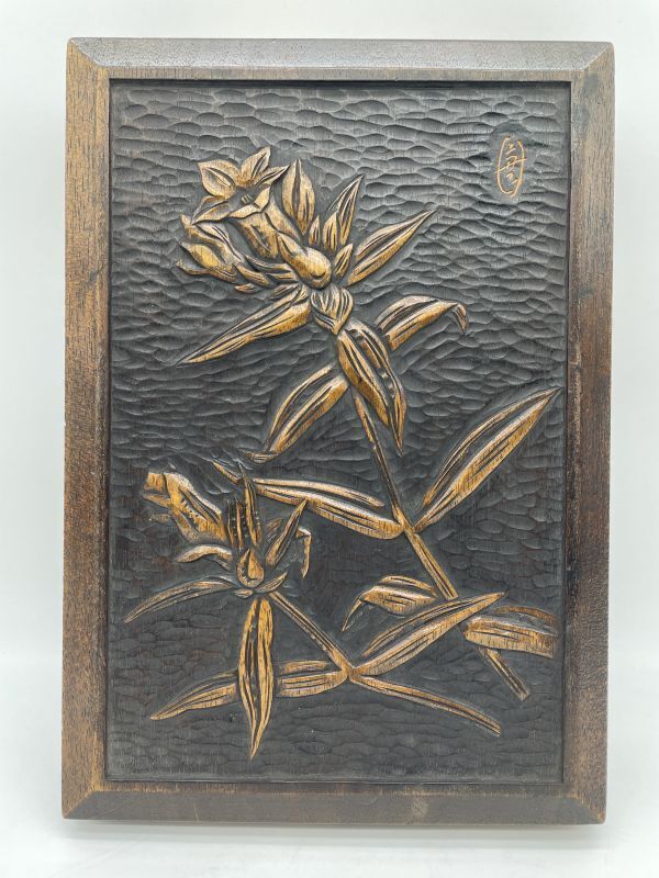 > 文箱 天然木 リンドウ花彫 植物草花彫刻 銘 硯箱 27×19×H5.5cm 586g 木製 書道箱 書道具 文房具入 道具箱 骨董品 文箱(11581)