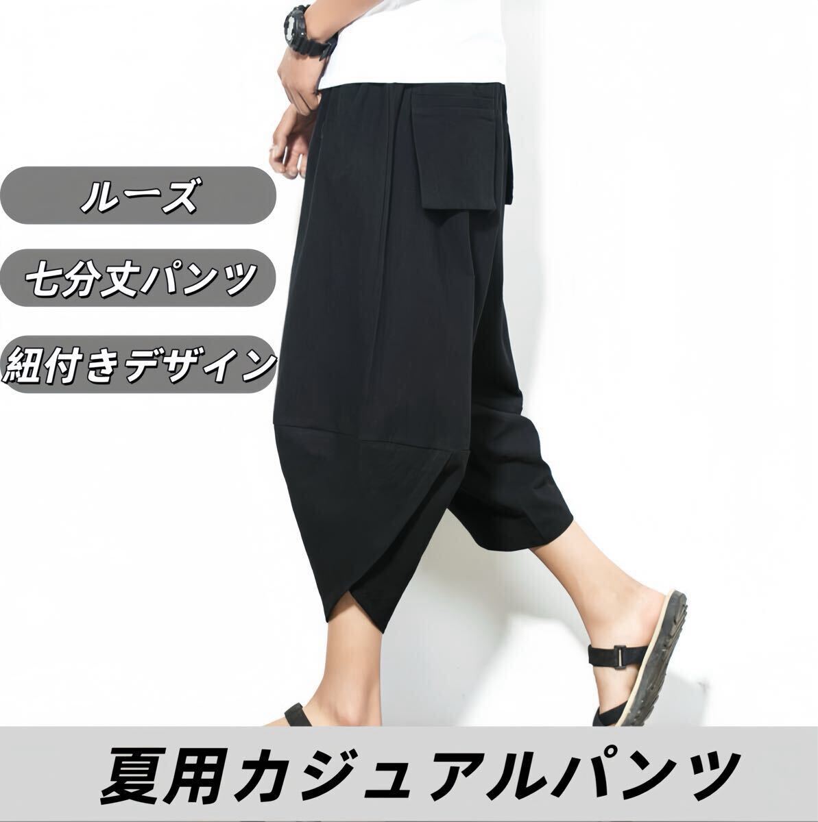 - 夏用ゆったり七分丈パンツ ユニセックス 軽量 速乾 通気 吸汗 カジュアル ドローストリングパンツ アラジンパンツ 綿麻風 ブラック