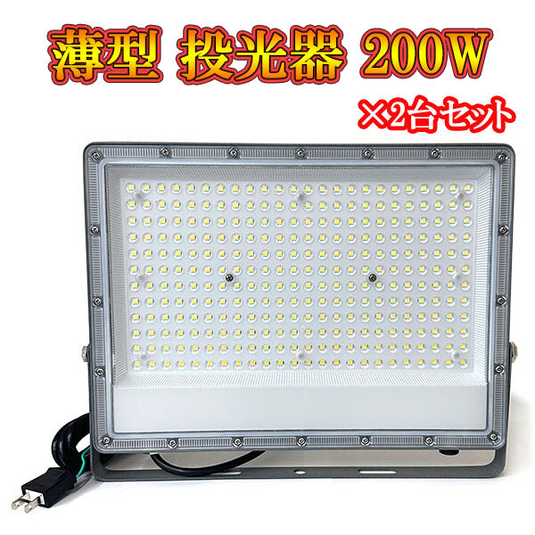 - LED投光器 ライト 200W プラグ付コード 防犯 防災 街路灯 外灯 駐車場 ガレージ 薄型 白色発光 2台セット
