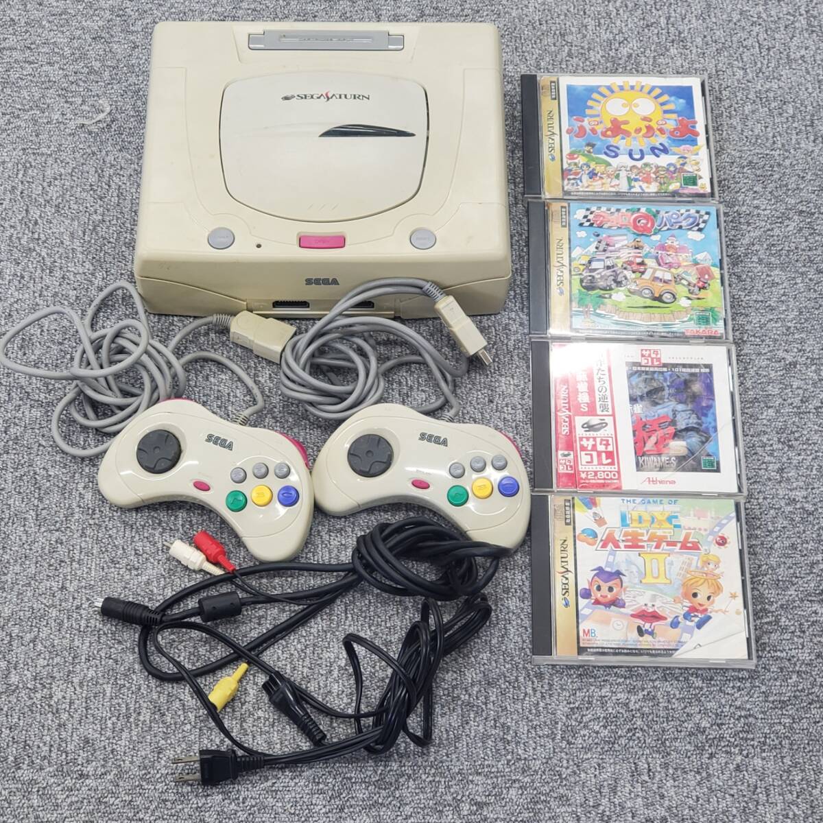 > セガサターン 本体 コントローラー 2本 ソフト 4本 チョロQ ぷよぷよ DX人生ゲームⅡ プロ麻雀極S 動作品 SEGA ケーブル付き #15107
