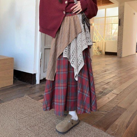 - ロングスカート フリルスカート チェック柄 レース レトロ お出かけ デート シンプル フリー ブラウン