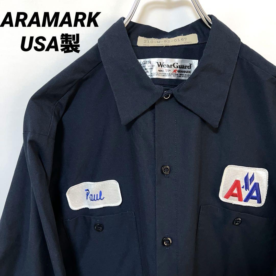 - N-5679 ARAMARK アラマーク アメリカ古着 USA製 ワークシャツ 長袖 企業ロゴ 刺繍 ワッペン L メンズ