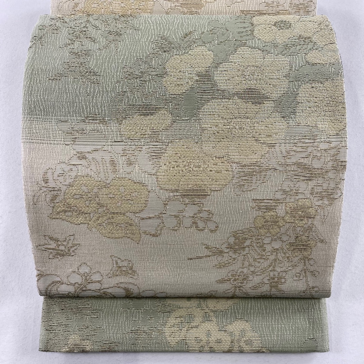 - 袋帯 名品 草花 段縞 金糸 灰緑 六通 正絹 【中古】