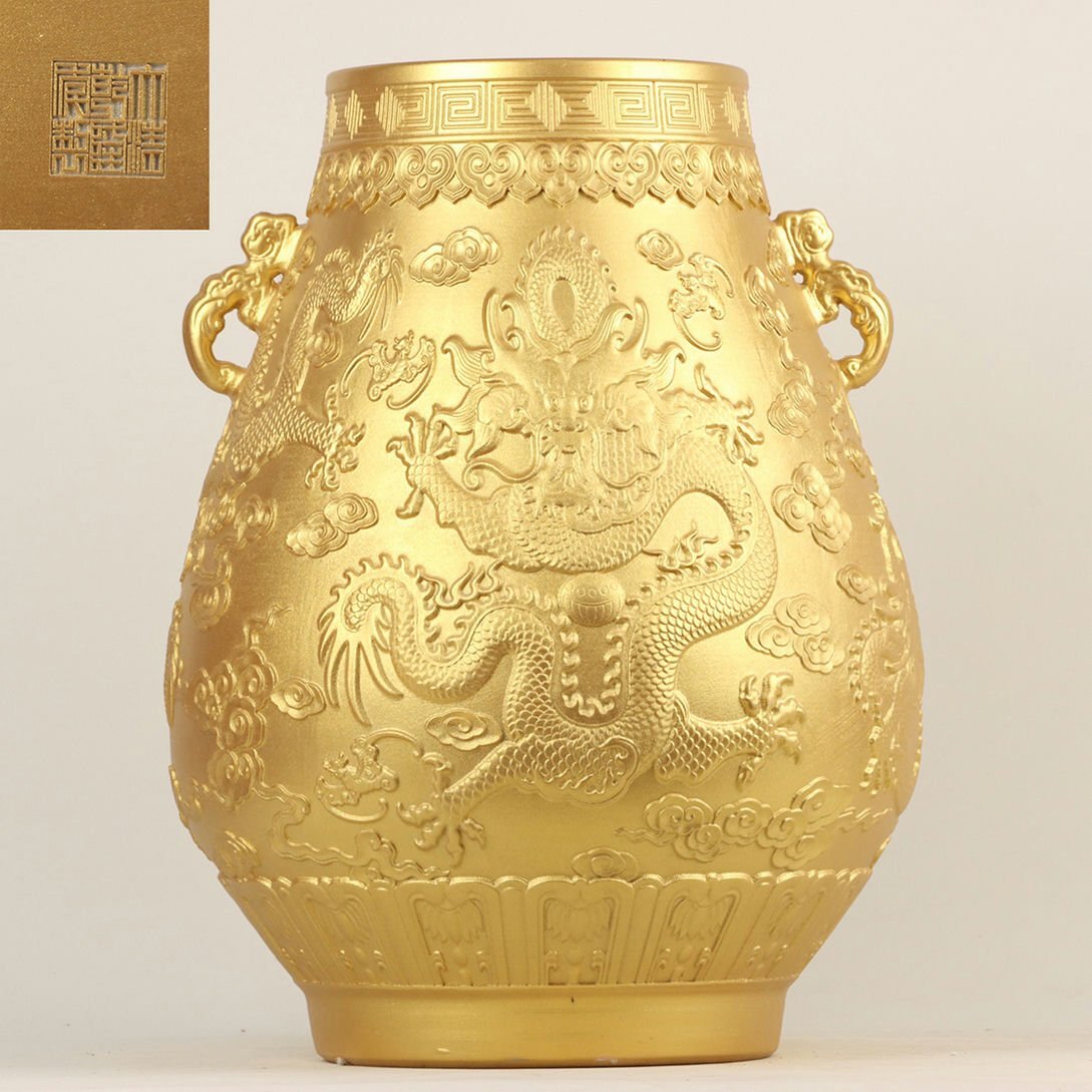 - ▼渡鶴羽▼M2085清乾隆年製 塗金浮彫九龍護主紋双耳罐・時代物・古陶磁・古賞物・旧家買出品