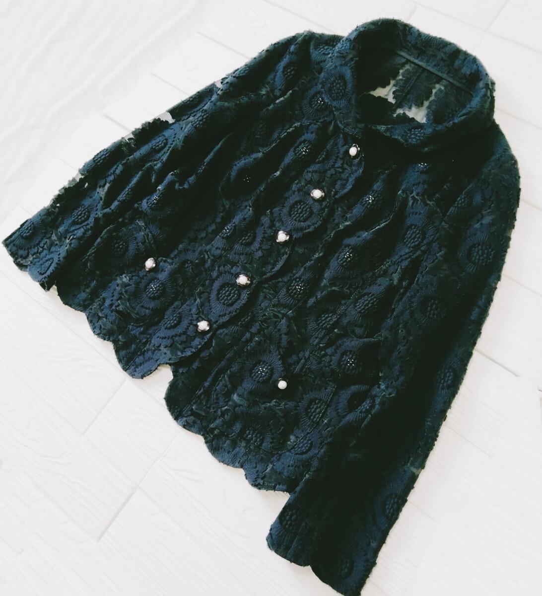 > 伊太利屋*La Moda GOJI*大きいサイズ13号*XL*ラ・モーダ・ゴジ*イタリヤ*ジャケット*花*黒*透け感*パール風ボタン*上着*フォーマル
