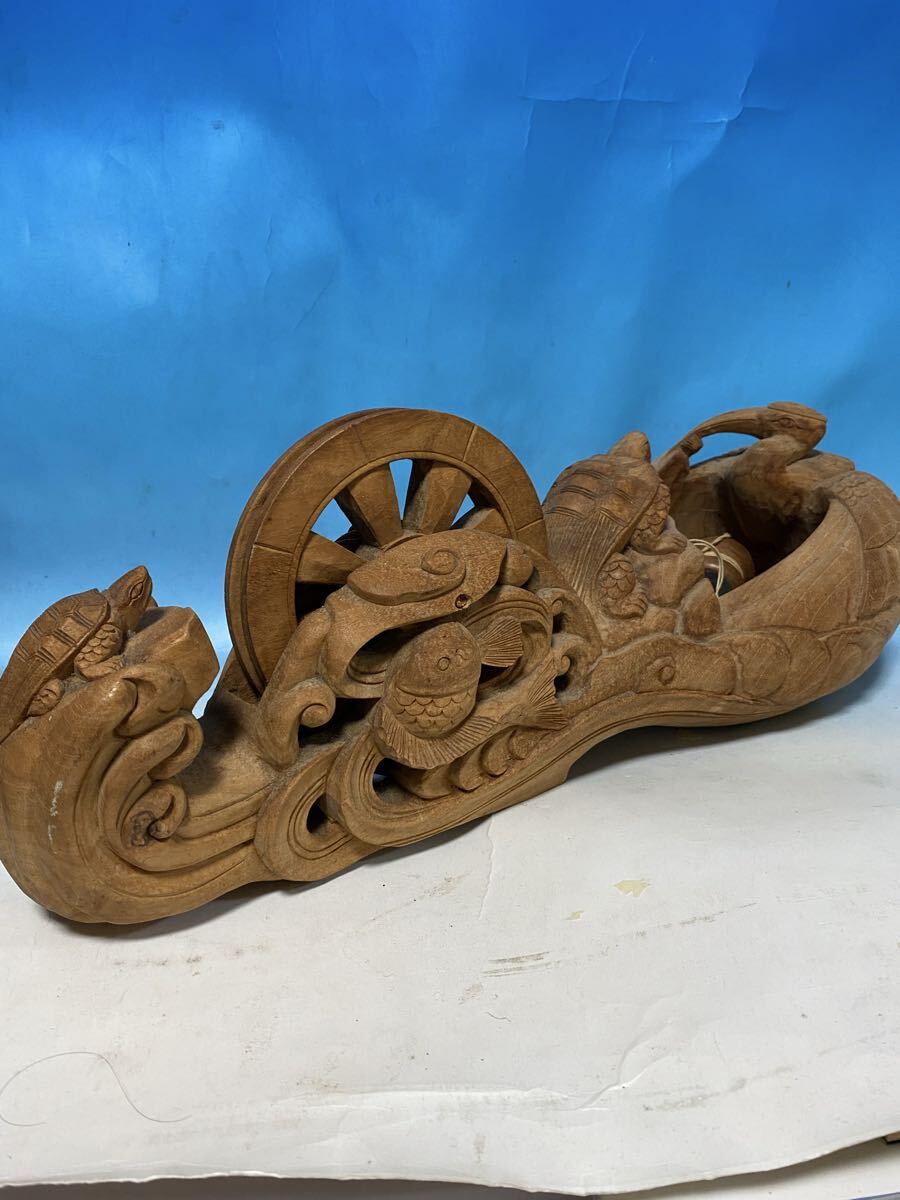 - 【大工道具】木彫 鶴亀龍竜鯛 細密和彫 雲竜鯛波 すみつぼ 墨壷 木彫 墨壺 欅 在銘寿 縁起物 墨つぼ