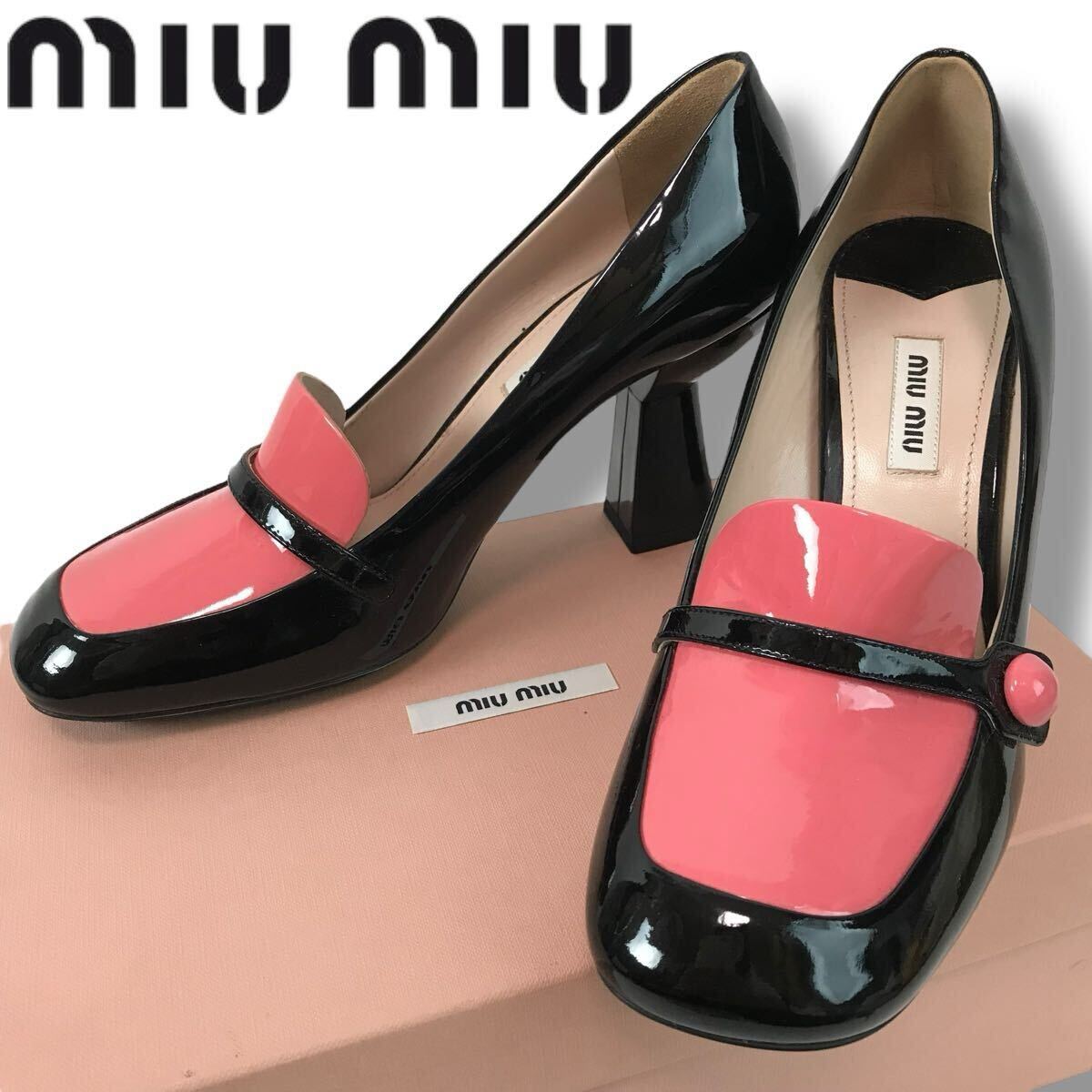 > c80 未使用 miu miu ミュウミュウ エナメル パンプス パテント レザー ローファー ハイヒール 正規品 ブラック ピンク 38.5 イタリア製
