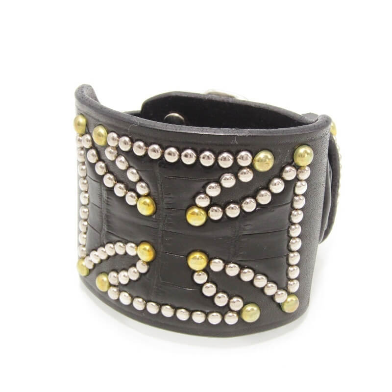 > 美品 STOPLIGHT ストップライト レザーブレスレット アイアンクロス スタッズ K18/SVメタル クロコダイルパッチ ダブルピン 28010886
