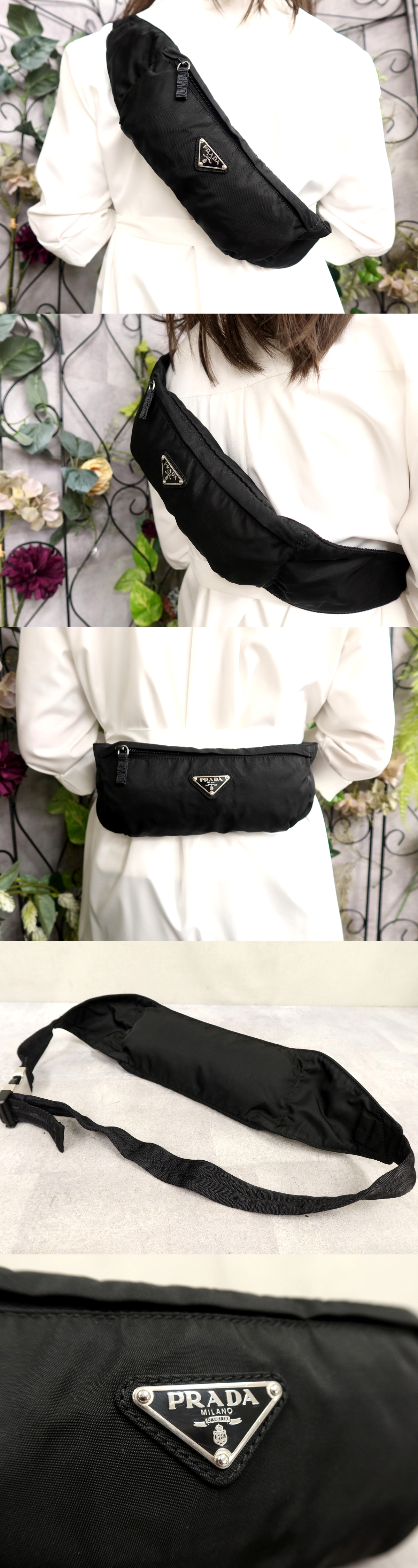 > ●超美品●PRADA プラダ●三角ロゴプレート●ポコノ ナイロン●ウエスト ポーチ ボディ バッグ●黒●シルバー金具●イタリア製●Js60354