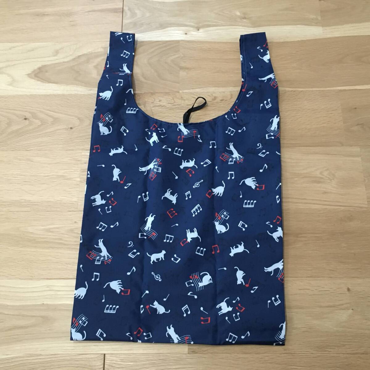 - ハンドメイド 手作り エコバッグ サブバッグ ネイビー ねこ柄 ネコ 猫 収納巾着付き