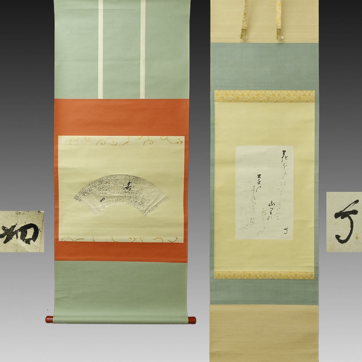 - 【真作】喜聞◆『裏千家 千宗室(淡々斎) 寿一字書扇面・武者小路千家 千宗守 和歌 2種』2幅 古筆 古文書 古書 能書家 茶人 茶道 京都 昭和