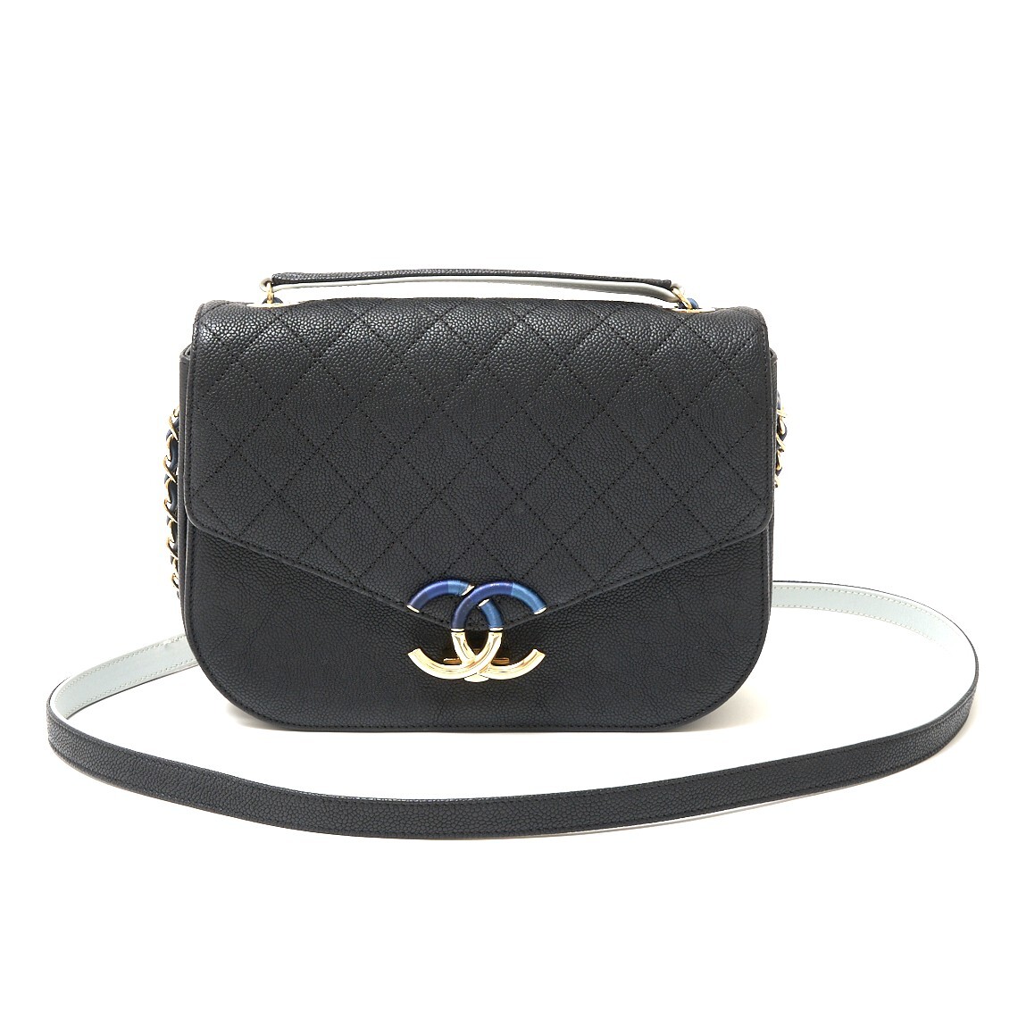 > CHANEL シャネル ハーフココ チェーン 2WAY バッグ 25番台 ハンド ショルダーBAG キャビアスキン ブラック×ブルー×ゴールド金具
