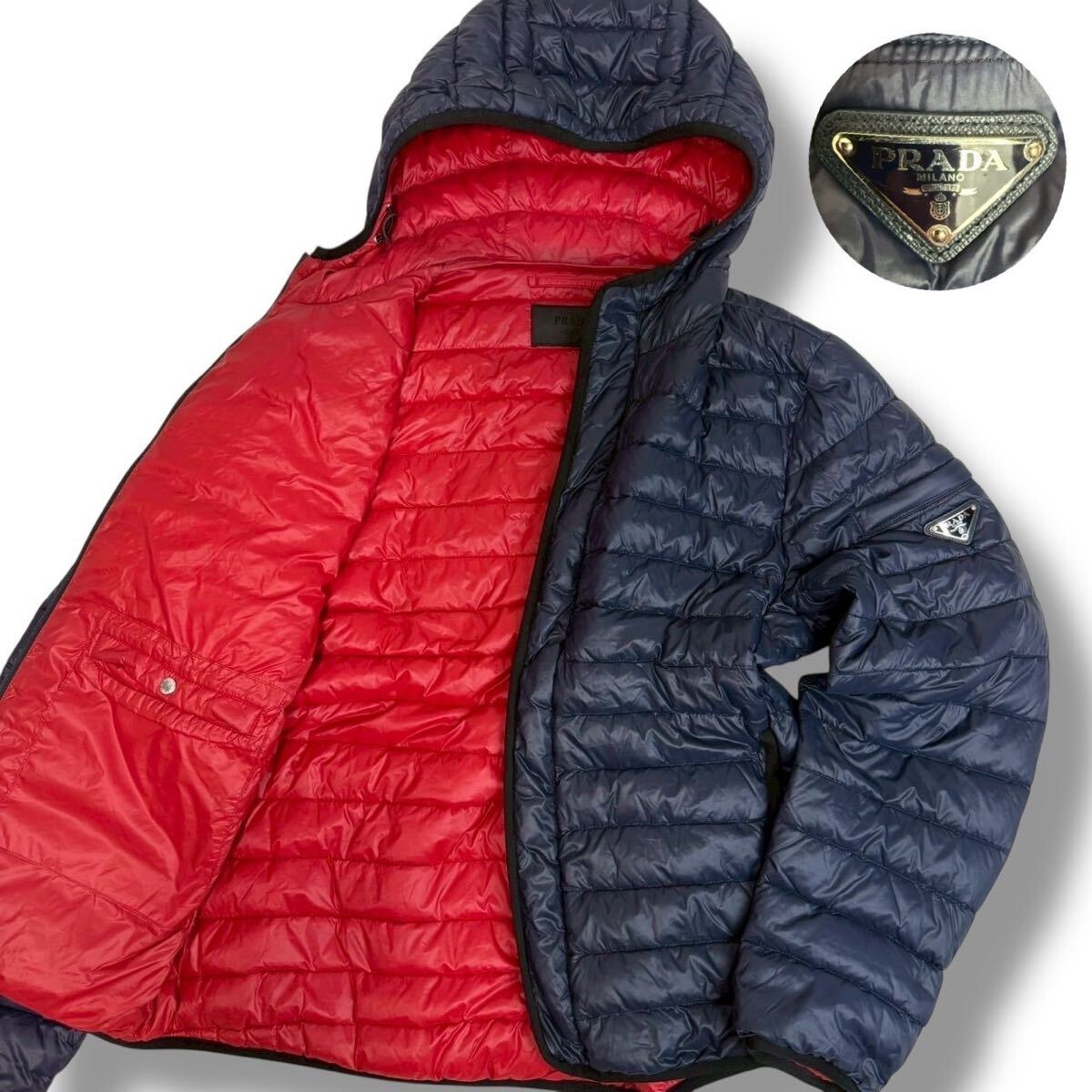 - 931 現行◎美品●プラダ PRADA 三角ロゴプレート ライト ダウンジャケット アウター ブルゾン ネイビー 紺 赤 フード ロゴM 46 メンズ