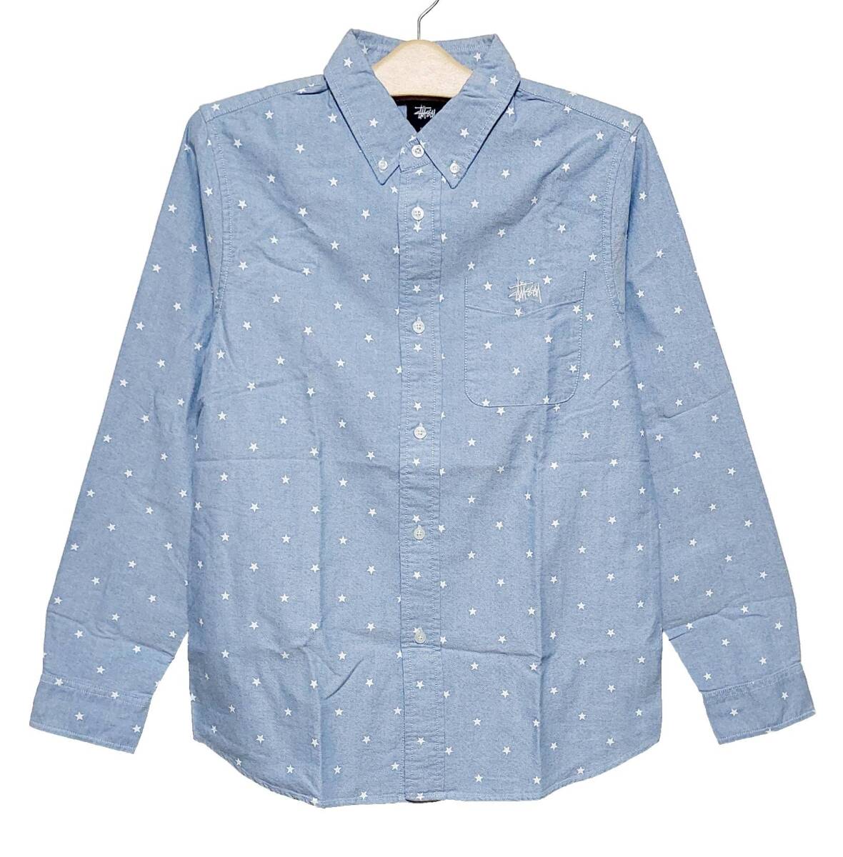 > 新品タグ付き!定価¥17380!STUSSY ステューシー 星総柄プリント 胸ポケロゴ刺繍 長袖コットンシャツ デニムシャツ S ライトブルー