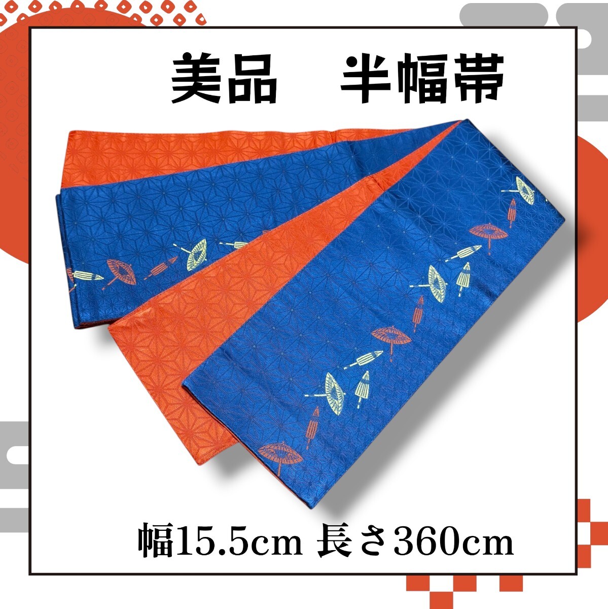 > 美品 半幅帯 紺色傘柄&朱色 リバーシブル 小袋帯 浴衣帯 着物帯