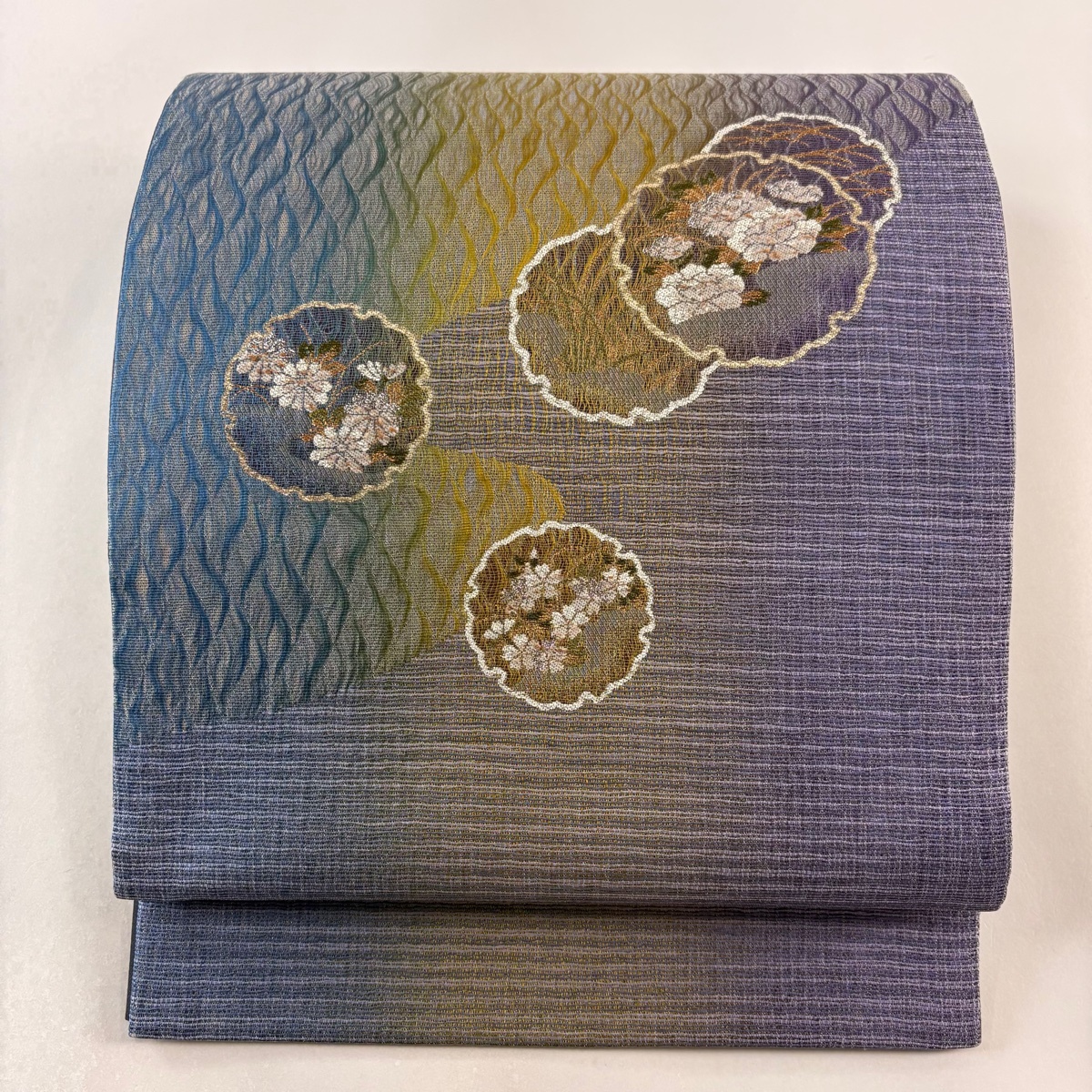 - 袋帯 美品 名品 和紙 バンブー ぜんまい やまと 雪輪 草花 金糸 箔 薄紫 お太鼓柄 正絹 【中古】