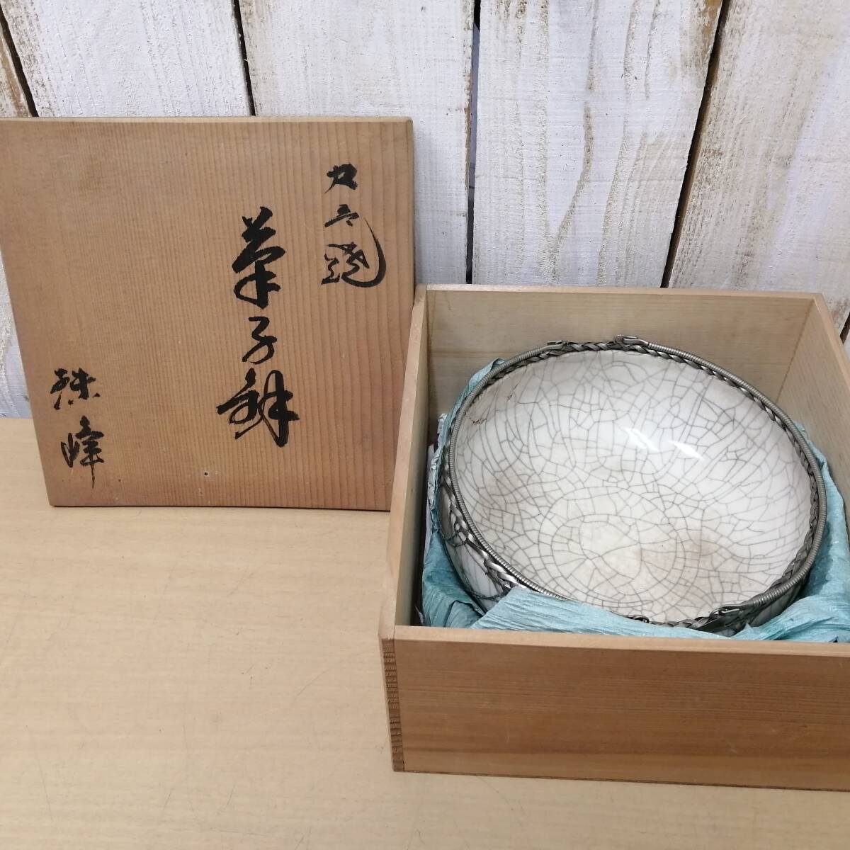 > ◎25092201v 菓子鉢 陶器 金属編み目 持ち手付き 直径約18.5cm 高さ約9cm 共箱入り 貫入 ヒビ有 昭和レトロ アンティーク