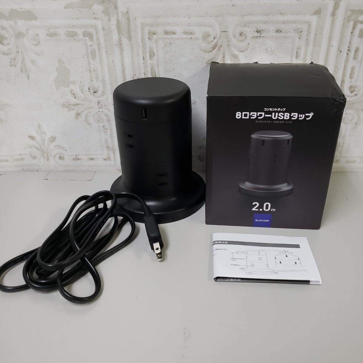 - 709y2203★エレコム 電源タップ タワー型 延長コード [ 8個口 & USB×5ポート ] 固定パーツ付 雷ガード ほこりシャッター 2m ECT-0620BK