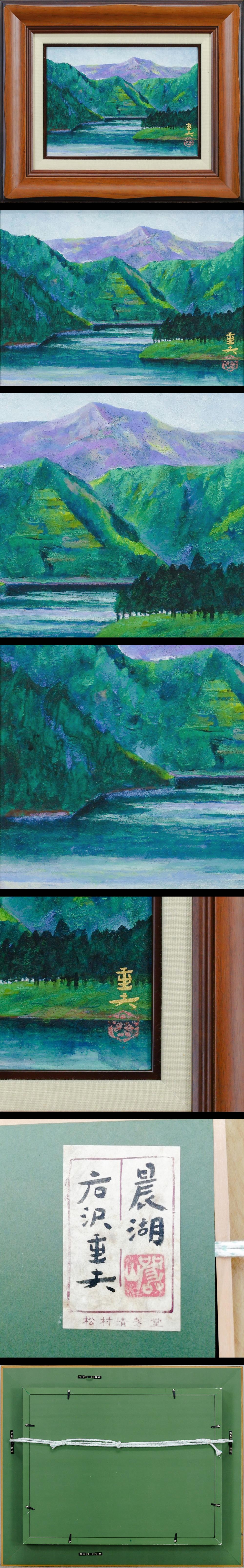 > 【真作】【WISH】岩澤重夫「晨湖」日本画 4号 金落款 共シール ◆紫の峰を望む・緑映える湖畔の山々 〇文化功労者 物故巨匠 #25092787