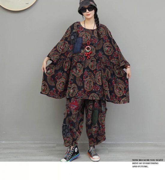 - gl 2509 チュニック&ズボン2点セット トップス 綿&麻 洋服ミックス アンティーク風 ロマンファッション 縫い合わせ 古い布 花柄