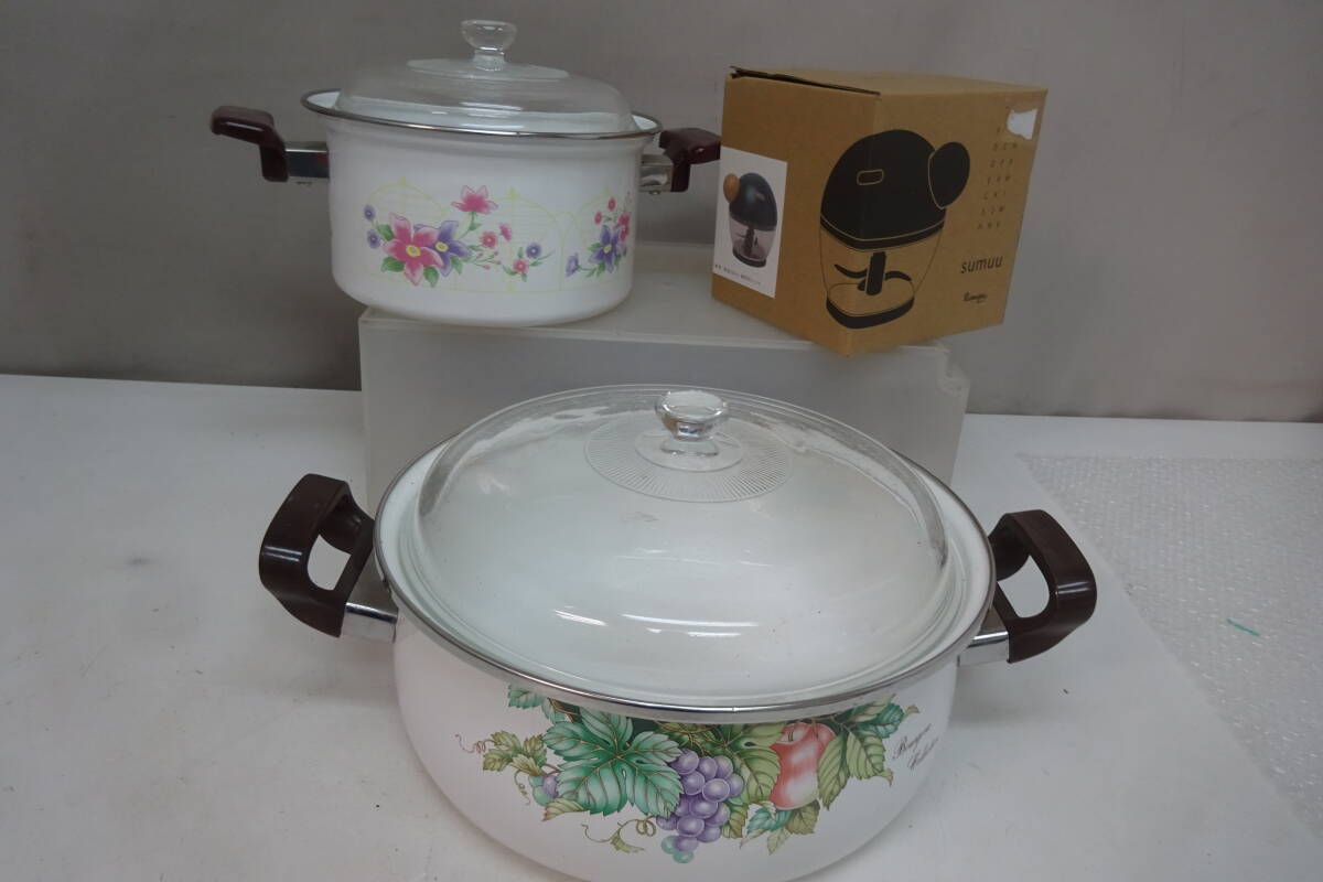 > ★166)まとめホーロー鍋2点&手動フードチョッパー・①Ф27x高さ11cm ②Ф19x高さ10cm ガラス蓋 箱なし※中古品/使用感現状品■100