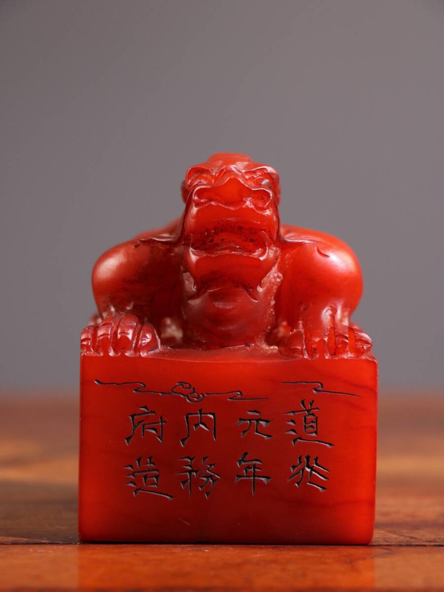 - 蔵友旧蔵出 寿山石 紅田黄石 細密彫 古龍印章 盒付 文房具 文案置物 書道品 稀少物品 置物 賞物 中国時代美術品