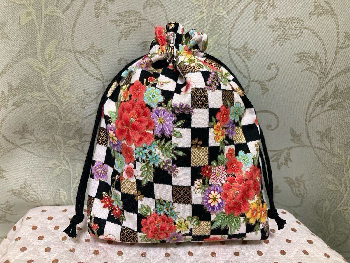 - 巾着袋 巾着 和柄 花 格子柄 金彩加工 ハンドメイド マチあり