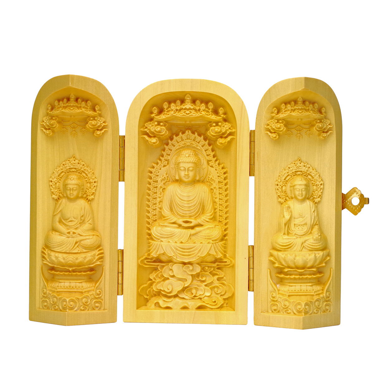 - 【新品】 釈迦如来 阿弥陀如来 薬師如来 三尊像 天然木製(柘植ツゲ) 約10cm 木彫仏像 彫刻 三開仏 三宝仏