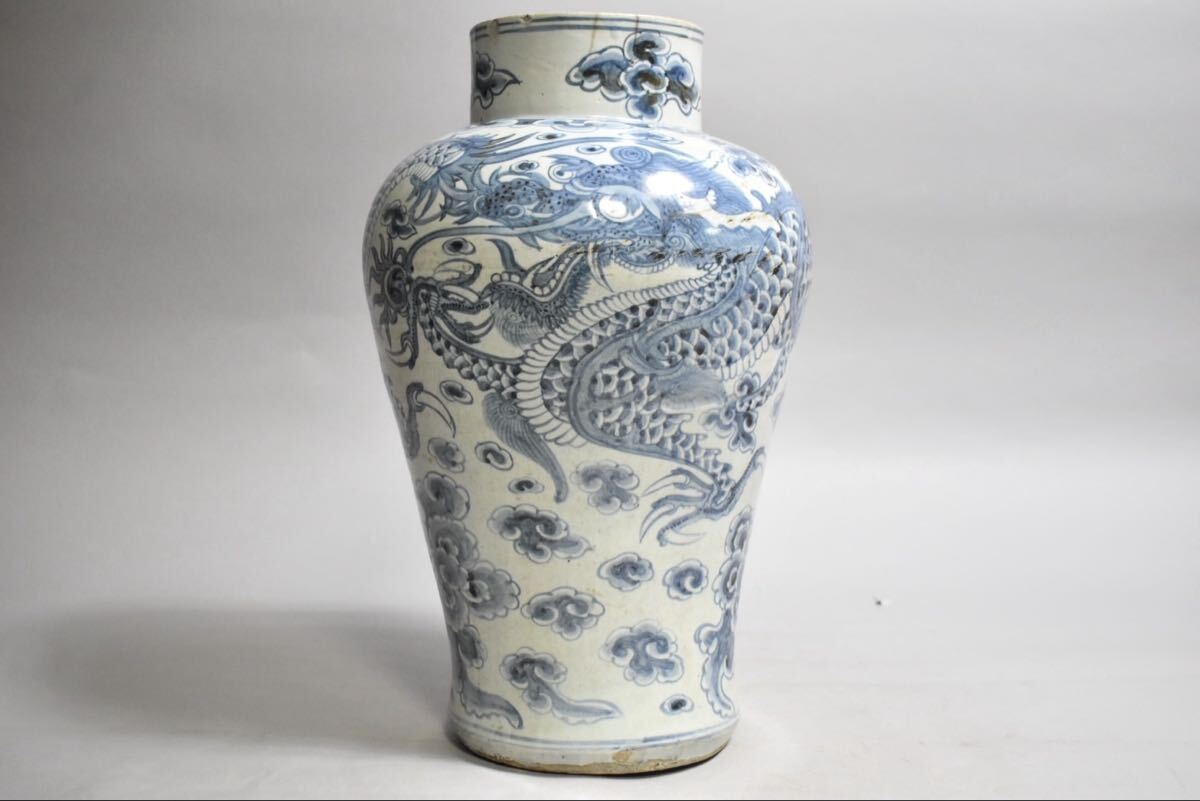 > 【英】A683 時代 李朝染付雲龍紋壺 H46.7㎝ 中国美術 朝鮮 韓国 高麗 李朝 壷 青花 花入 骨董品 美術品 古美術 時代品 gy