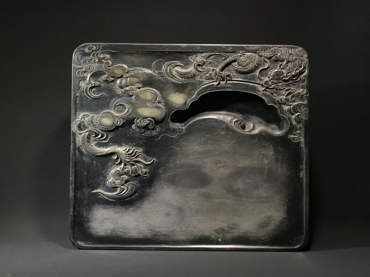 - 清代 端石浮彫 龍行天下文房端渓硯 張之洞銘【仁】手彫り 文房具 書道具 中国古硯 蔵出