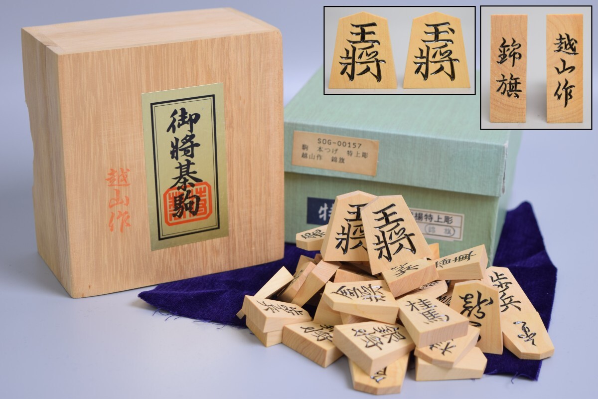 - 将棋駒 御将棋駒 越山作 本黄楊 特上彫 錦旗 黄楊 彫駒 彫り駒 黒彫 彫刻 桐箱 木製 木工品 在銘 計41駒 駒箱 将棋 駒 コマ RR-59K/510