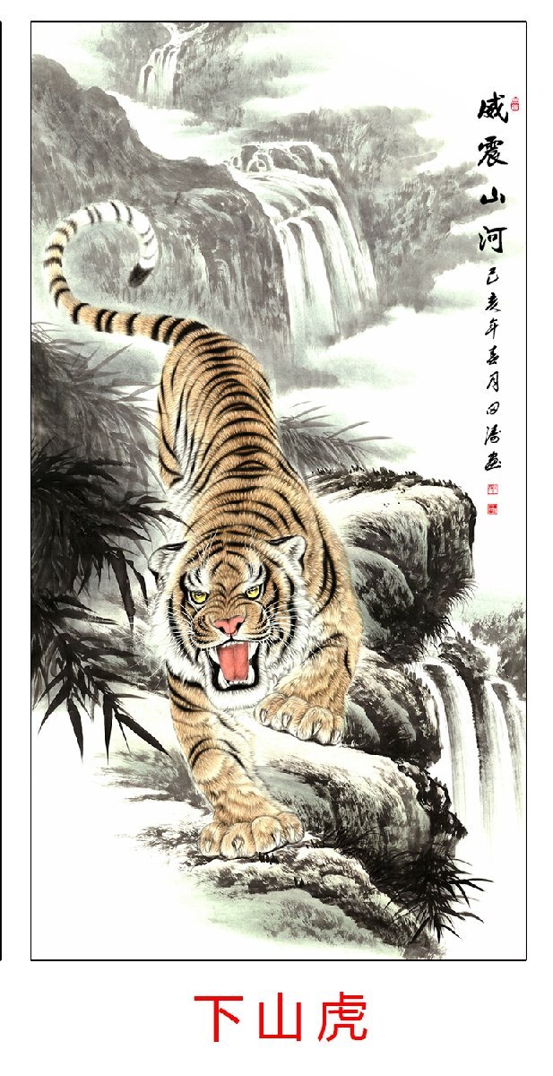 - 中国美術 中国水墨画 トラ 虎 下山虎 リビング 掛軸 縦軸 学習見本 表装なし 画仙紙 画芯 鑑賞 装飾 50*95cm 印刷 zh1655