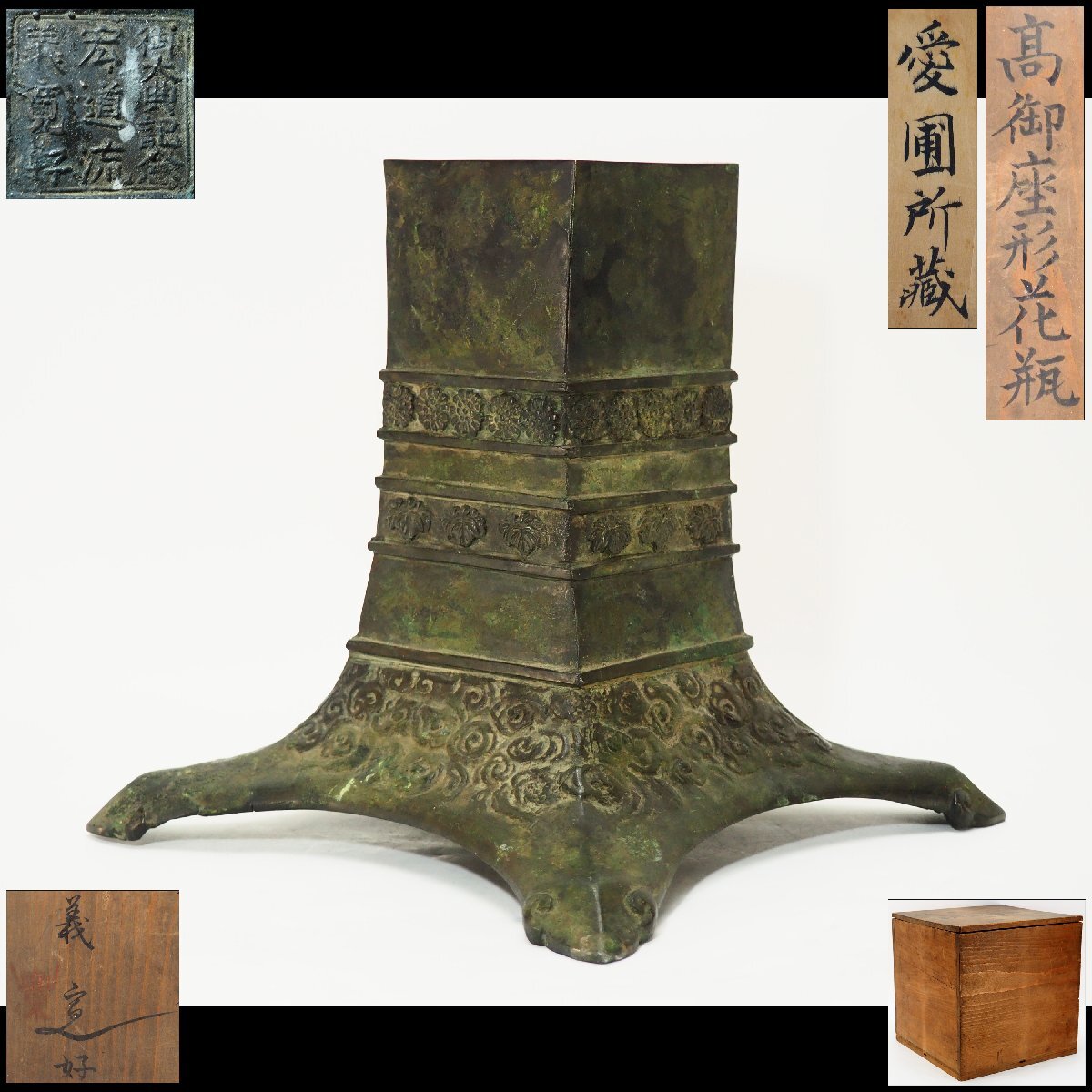 > 【治】『小原宏道』流 義寛好 唐銅製 御大典記念 高御座形花瓶☆箱付 高さ 24.2cm (検索:薄端 花入 水盤 花器 花瓶 華道具 池坊) AQ09