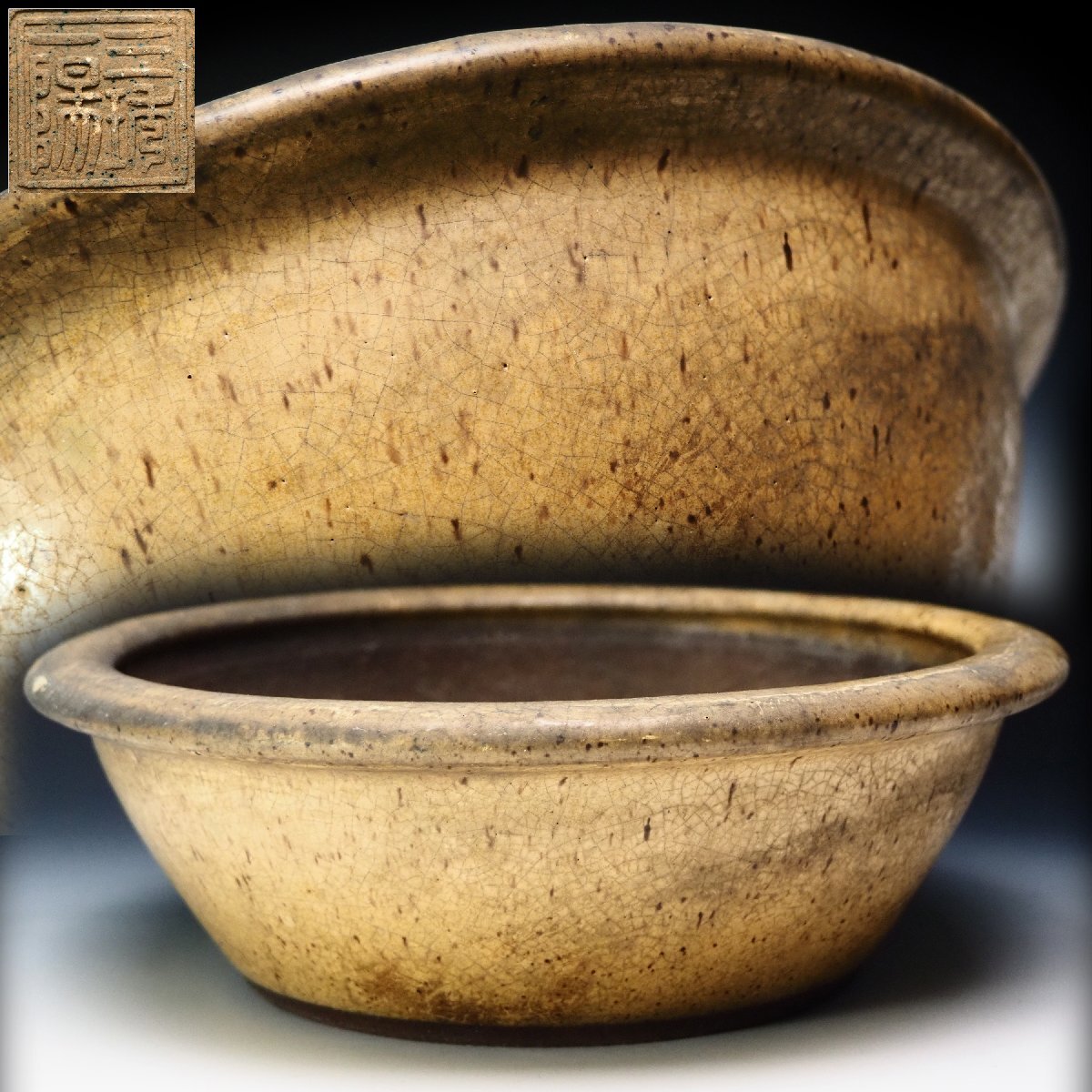 > 【治】『三琇一陽』作 黄釉円式盆栽鉢☆幅 24.2cm (検索:時代品 古作 古い 盆景 小品鉢 鉢 盆栽 盆栽鉢 植木鉢 紫砂 和鉢) RK092
