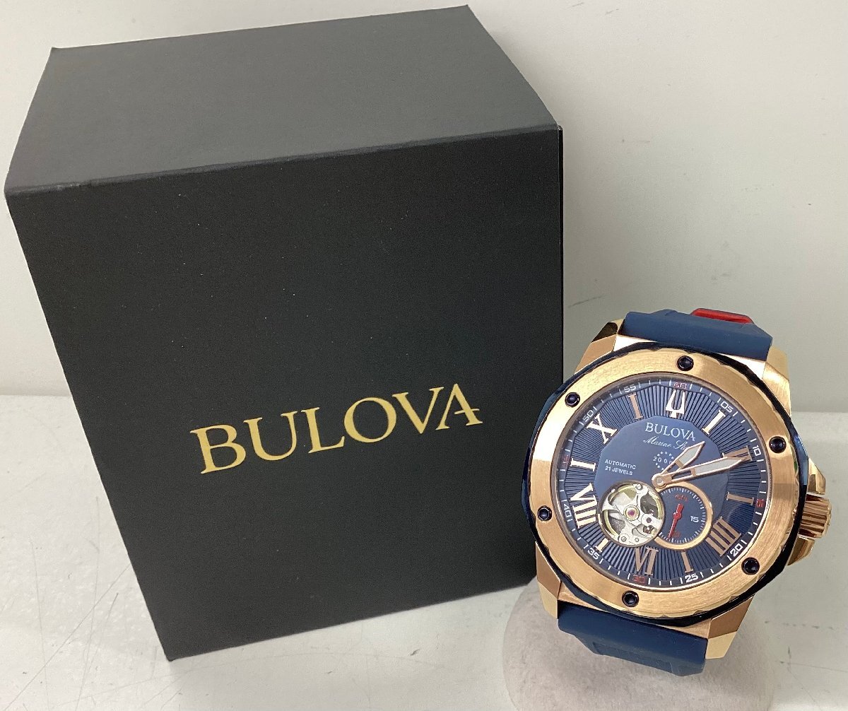 - 【稼動品】BULOVA ブローバ マリンスター 98A227 自動巻き 裏スケ ネイビー×レッド シリコンラバーベルト 箱 保証書付き